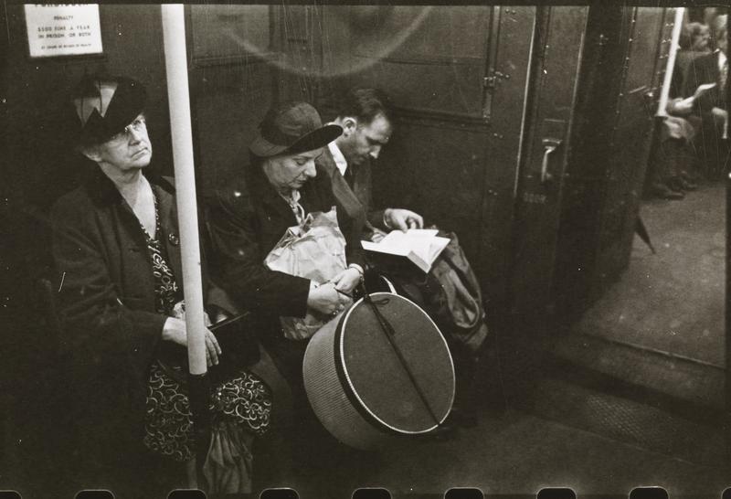 Life and Love on the New York City Subway [Passengers on a subway, one with a large hat box.]