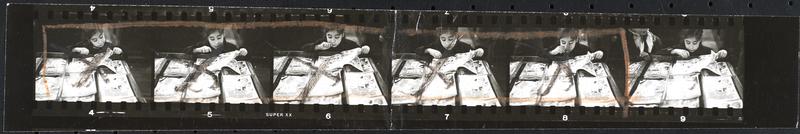 Magazine caption: "While she follows the adventures of Donald Duck and the Katzenjammer Kids, this young 5 and 10 customer absent-mindedly munches a foot-long piece of licorice. And as long as the candy holds out, she stands by her comic book heroes through thick and thin. Like any reader, she smiles when her story has a happy ending."