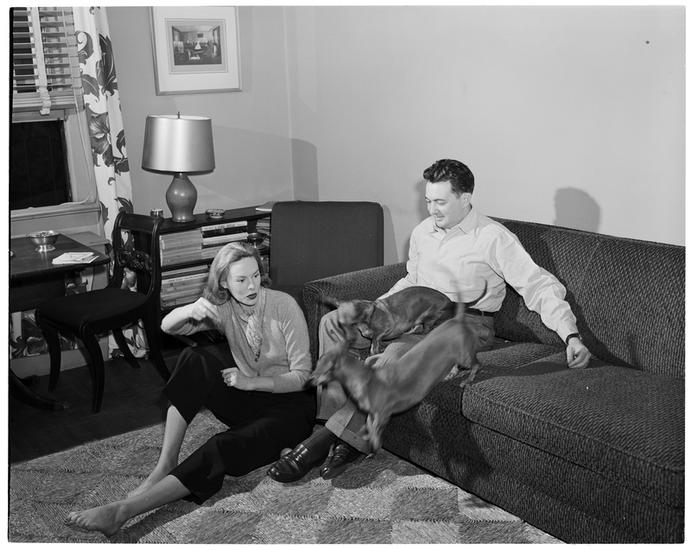 Fashion Models: Lisa Fonssagrives [Meg Mundy and unidentified man playing with dogs at home.]