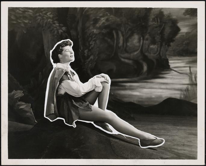[Katharine Hepburn as Rosalind, Cloris Leachman as Celia and Jay Robinson as Le Beau in "As You Like It".]