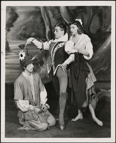 [Katharine Hepburn as Rosalind, Cloris Leachman as Celia and Jay Robinson as Le Beau in "As You Like It".]