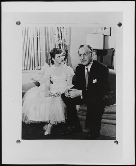 [Polly Rowles as Agnes Carol, Nancy Malone as Ginger, and Melvyn Douglas as Howard Carol in "Time Out for Ginger".]