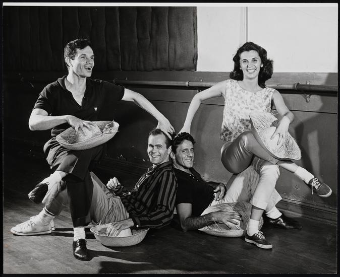 [Choreographer/director Michael Kidd with his assistants Shelah Hackett and Deedee Hood during a dance rehearsal of "Destry Rides Again".]