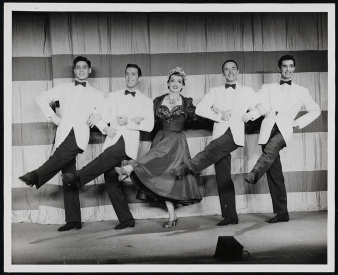 [Bette Davis in the "Roll Along, Sadie" number in "Two's Company".]
