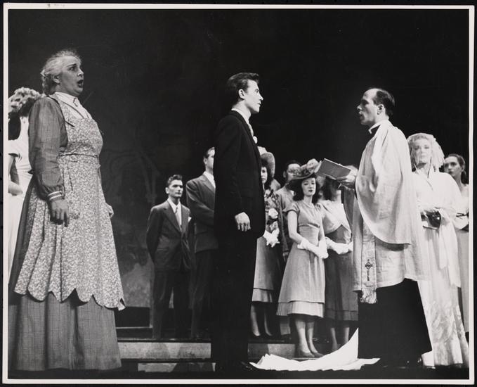[Lisa Kirk as Emily, John Battles as Joseph Taylor, Jr., and Roberta Jonay as Jennie Brinker in "Allegro".]
