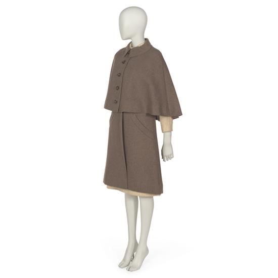 Suit comprising tweed cape and skirt, belt and black knit blouse