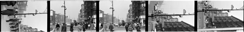 Changing New York [View of an unidentified block in Harlem from inside a butcher shop and Lenox Avenue and 117th Street.]