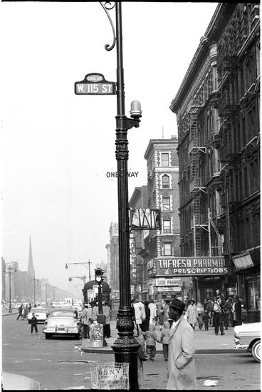 Changing New York [View of an unidentified block in Harlem from inside a butcher shop and Lenox Avenue and 117th Street.]