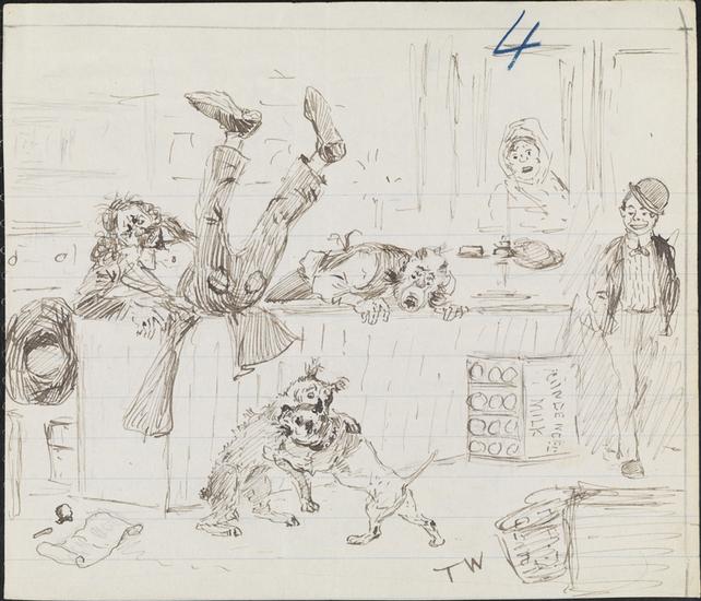 [Goat drinking baby's bottle in front of Finnegan's corner grocery.]