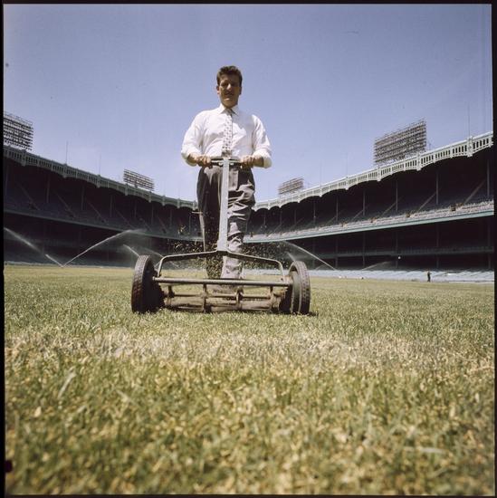 Yankee Stadium [Superintendent Jim Thompson mowing grass on the baseball field.]