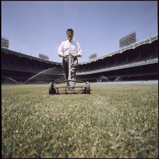 Yankee Stadium [Superintendent Jim Thompson mowing grass on the baseball field.]