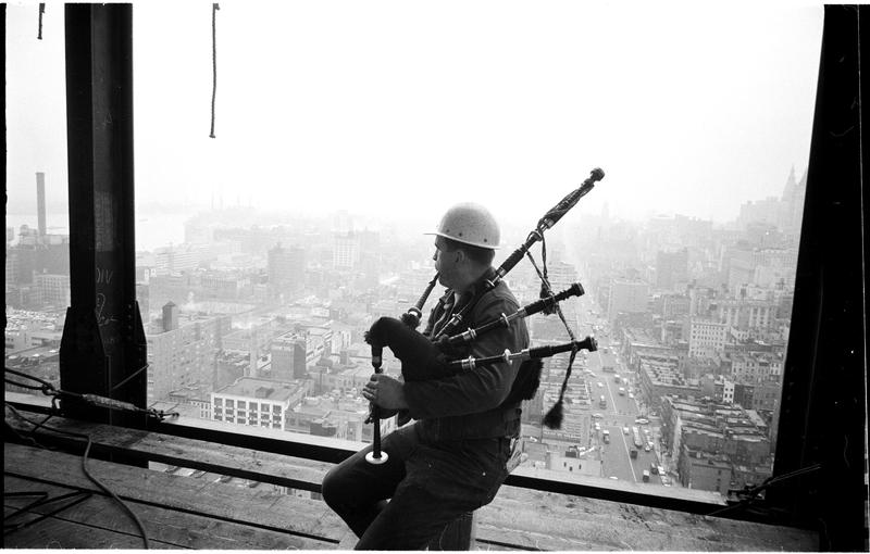 Changing New York  [Construction worker playing a bagpipe in an unfinished building.]