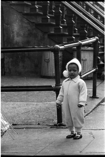 Changing New York [Men sitting on a stoop, small child walking, and an East Harlem streetscape.]