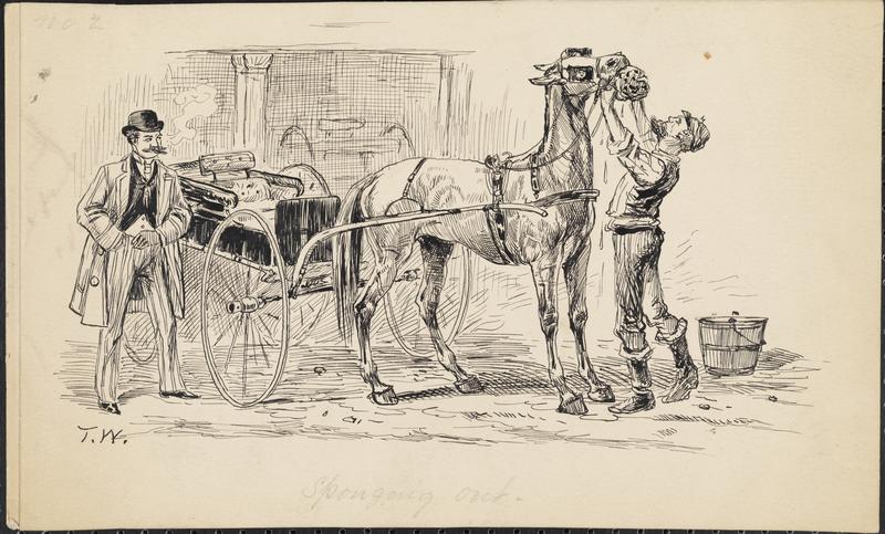 [The trotting horse Judge Fullerton biting off man's hat.]