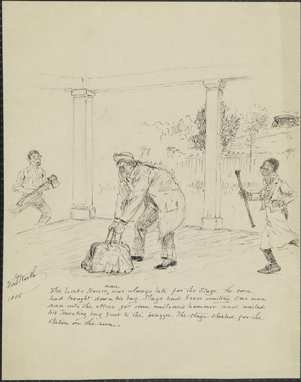 [Man boarding a covered sleigh.]