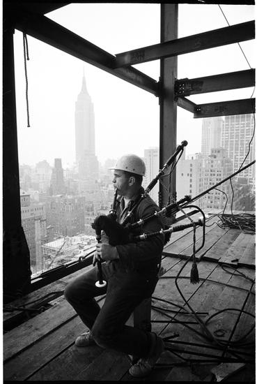 Changing New York  [Construction worker playing a bagpipe in an unfinished building.]