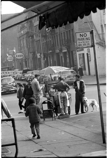 Changing New York [Customers at an outdoor food vendor and people sitting on stoops.]
