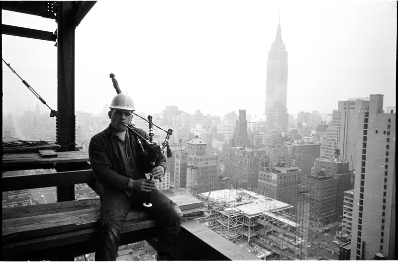 Changing New York [Construction worker playing a bagpipe and sitting on scaffolding. ]