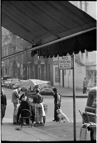 Changing New York [Customers at an outdoor food vendor and people sitting on stoops.]