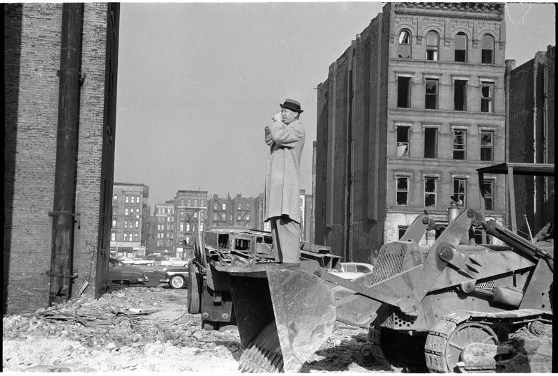 Changing New York [Man taking pictures of dilapidated buildings while standing on an excavator.]