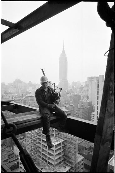Changing New York [Construction worker playing a bagpipe and sitting on scaffolding. ]