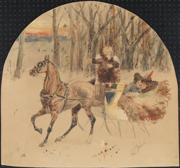 [Stagecoach traveling through snow in the countryside.]