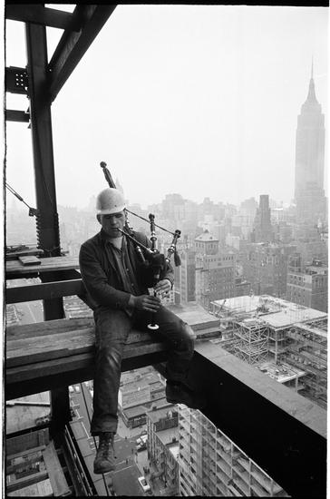 Changing New York [Construction worker playing a bagpipe and sitting on scaffolding. ]