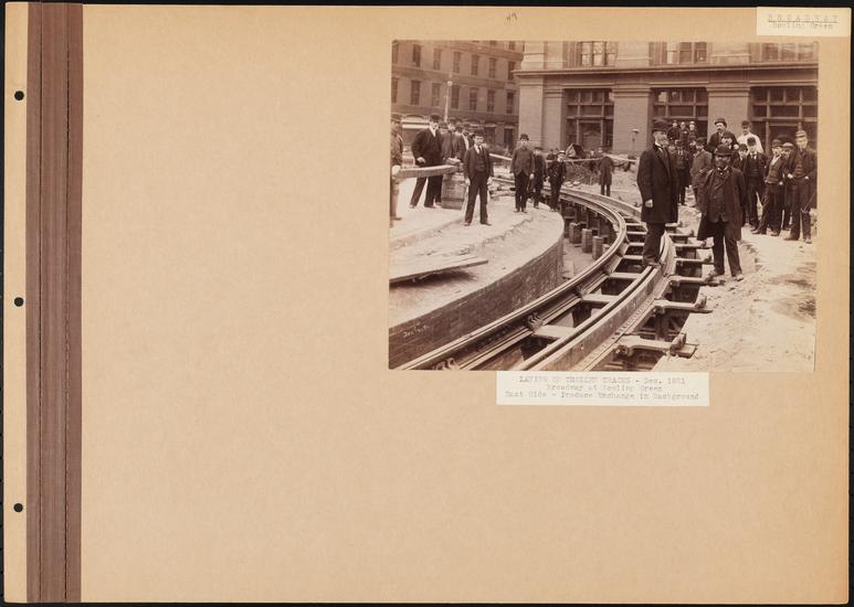 Laying of trolley tracks - Dec. 14 1891, Broadway at Bowling Green, east side - Produce Exchange in background | J. Clarence Davies Street Views Scrapbook.