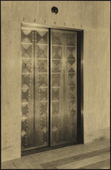 Building, northwest corner 37th Street and 6th Avenue [Elevator door.]