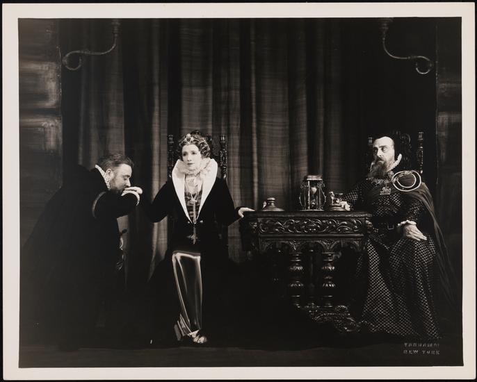 [Ernest Cossart as Lord Throgmorton, Helen Menken as Elizabeth Tudor and George Coulouris as Lord Burghley or Lord Erskine in "Mary of Scotland".]