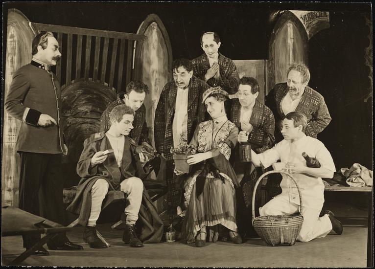 Standardized transliteration of the English title is "Der braver soldat Shveyik". Michael Gorrin is seated on the left.