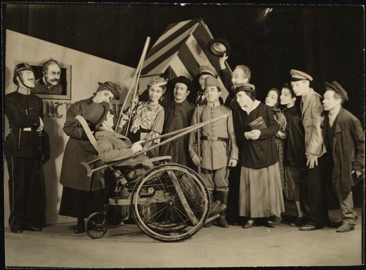 Michael Gorrin is in the wheelchair. Standardized transliteration of the English title is "Der braver soldat Shveyik".