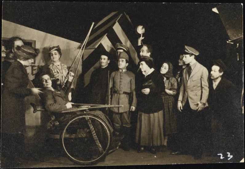 Standardized transliteration of the English title is "Der braver soldat Shveyik". Michael Gorrin is in the wheelchair.