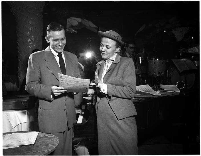 [Men watching Peggy Lee record at the Copa Lounge.]