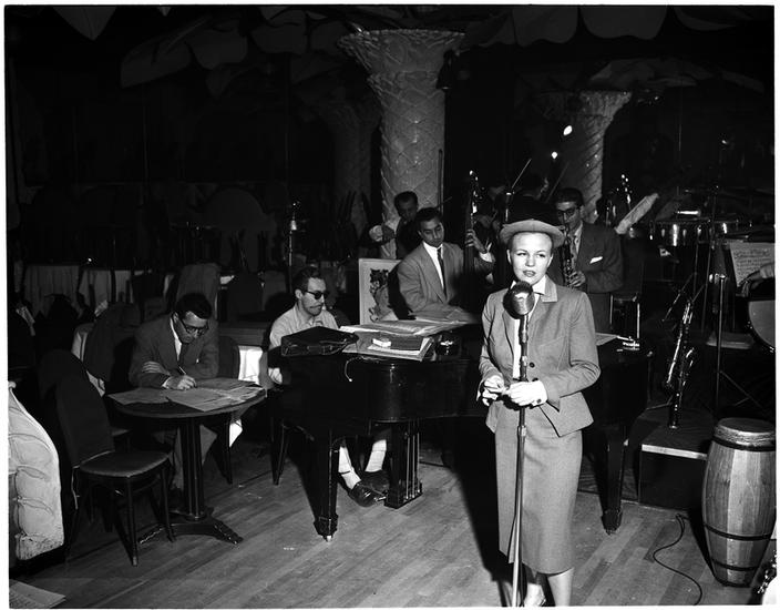 [Men watching Peggy Lee record at the Copa Lounge.]