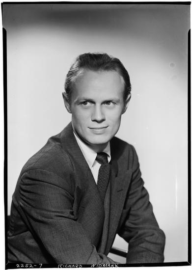 [Richard Widmark as Lieut. Lenny Archer and Judith Parrish as Mildred Pringle in "Kiss and Tell".]