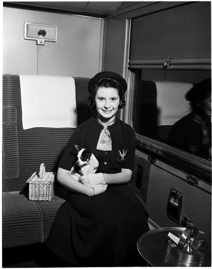 [Margaret O'Brien with unidentified woman, holding a dog and looking out of the window of a passenger car.]
