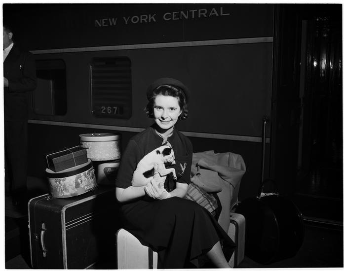 [Margaret O'Brien holding a dog inside a passenger car.]