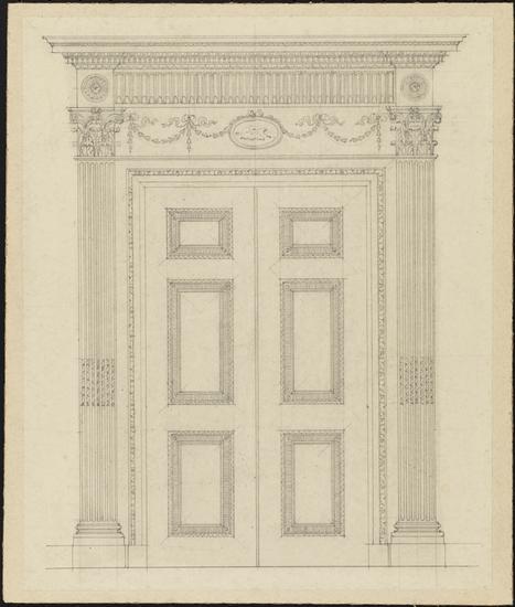[Wall with mahogany door, two mahogany chests and two mirrors.]