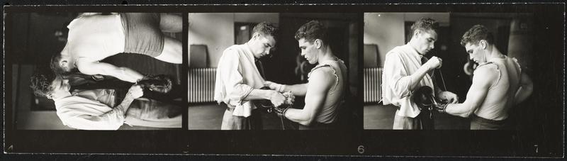 Walter Cartier, Prizefighter of Greenwich Village [Vincent Cartier helping Walter Cartier put on his boxing gloves.]