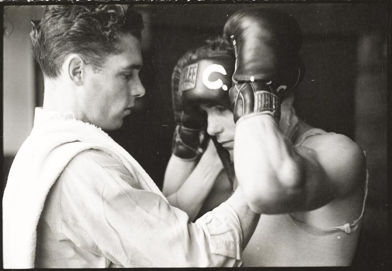 Walter Cartier, Prizefighter of Greenwich Village [Vincent Cartier helping Walter Cartier take his boxing gloves off.]