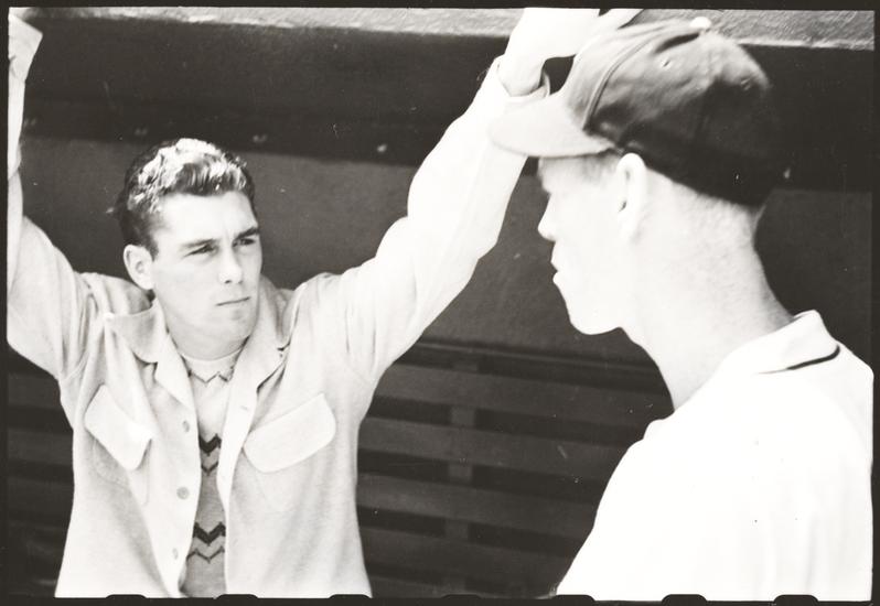 Walter Cartier, Prizefighter of Greenwich Village [Walter Cartier talking to a New York Giants player in the dugout.]