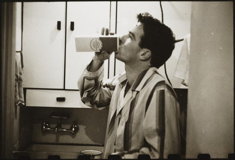 Montgomery Clift - Glamour Boy in Baggy Pants [Montgomery Clift drinking milk out of the carton and drinking from a bottle while laying on the floor.]