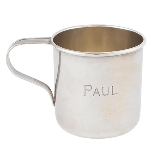 Cylindrical cup with rolled wire lip, C-shaped handle, gilt interior, and rolled edges terminating in a head. Inscription: On body: "PAUL" in two sizes of san-serif capitals. Mark: Incuse, stamped on underside of base: "STERLING/[trademark]/4566".