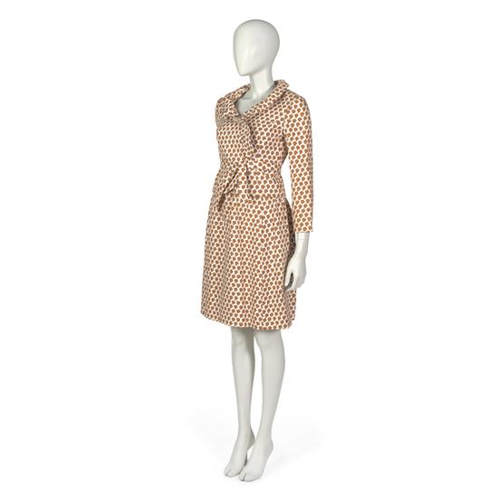 Evening ensemble in geometric printed cotton velveteen, comprising cloak and dress