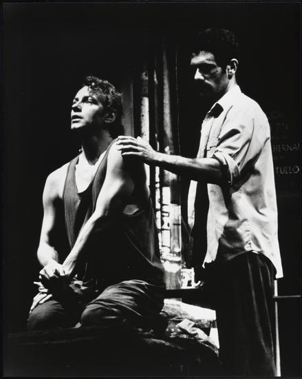 [Brent Carver as Molina and Anthony Crivello as Valentin in "Kiss of the Spider Woman".]