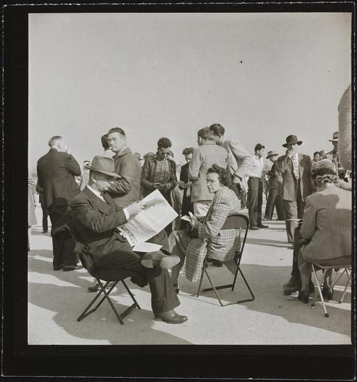 Aqueduct Race Track [Spectators reading newspapers at the racetrack.]