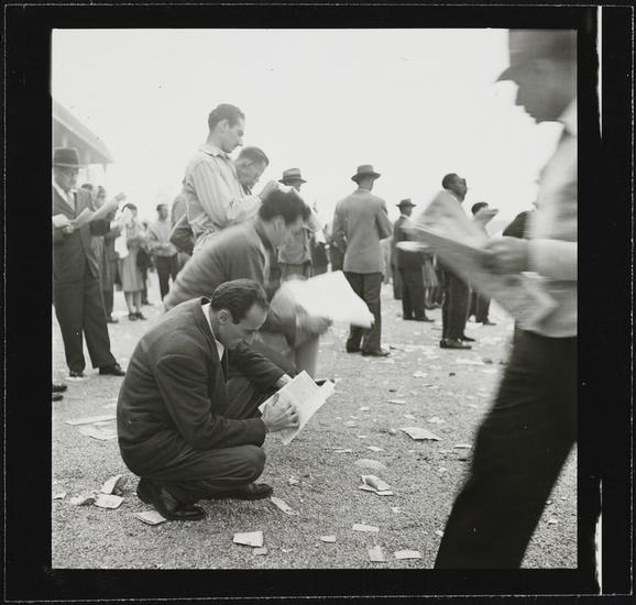Aqueduct Race Track [Men reading newspapers and racing forms.]