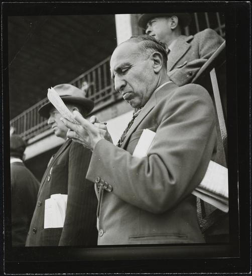 Aqueduct Race Track [Men looking at racing forms at a racetrack.]