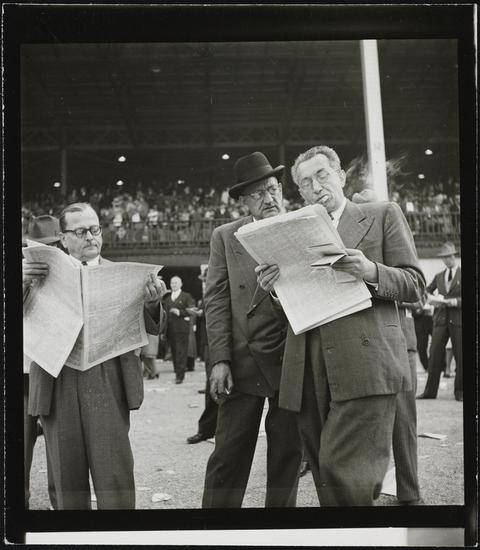 Aqueduct Race Track [Men reading newspapers at a racetrack.]